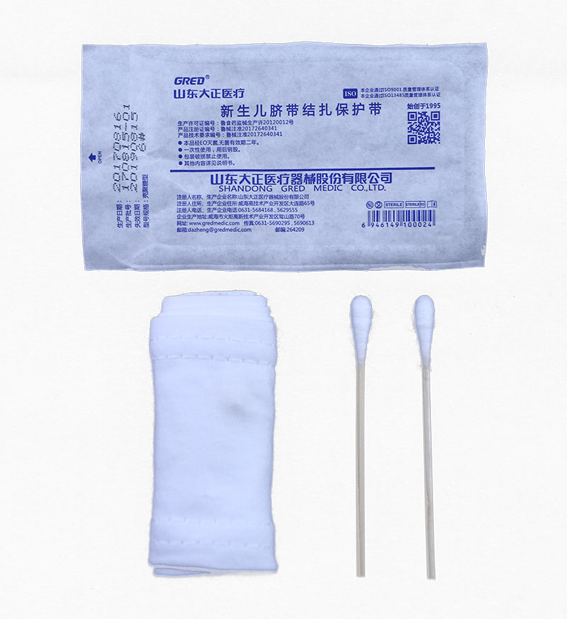 Purposes: after treatment of conventional cutting umbilical cord for the newborn, open the umbilical cord kit, and align the Chitosan core (or gauze core) with the residual end of umbilical cord to bandage and fasten it.